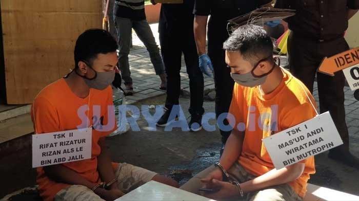 Reka ulang kejadian diperankan langsung kedua pelaku yaitu Mas'ud Andy Wiratama (23) warga Beringin, Kelurahan Pamotan, Kecamatan Porong, Kabupaten Sidoarjo, dan Rifat Rizatur Rizan (20) warga Jalan Trem Sentul, Kecamatan Tanggulangin, Kabupaten Sidoarjo.