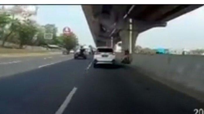 Dalam video itu tampak pengendara motor melintas sisi kanan di Tol Japek.