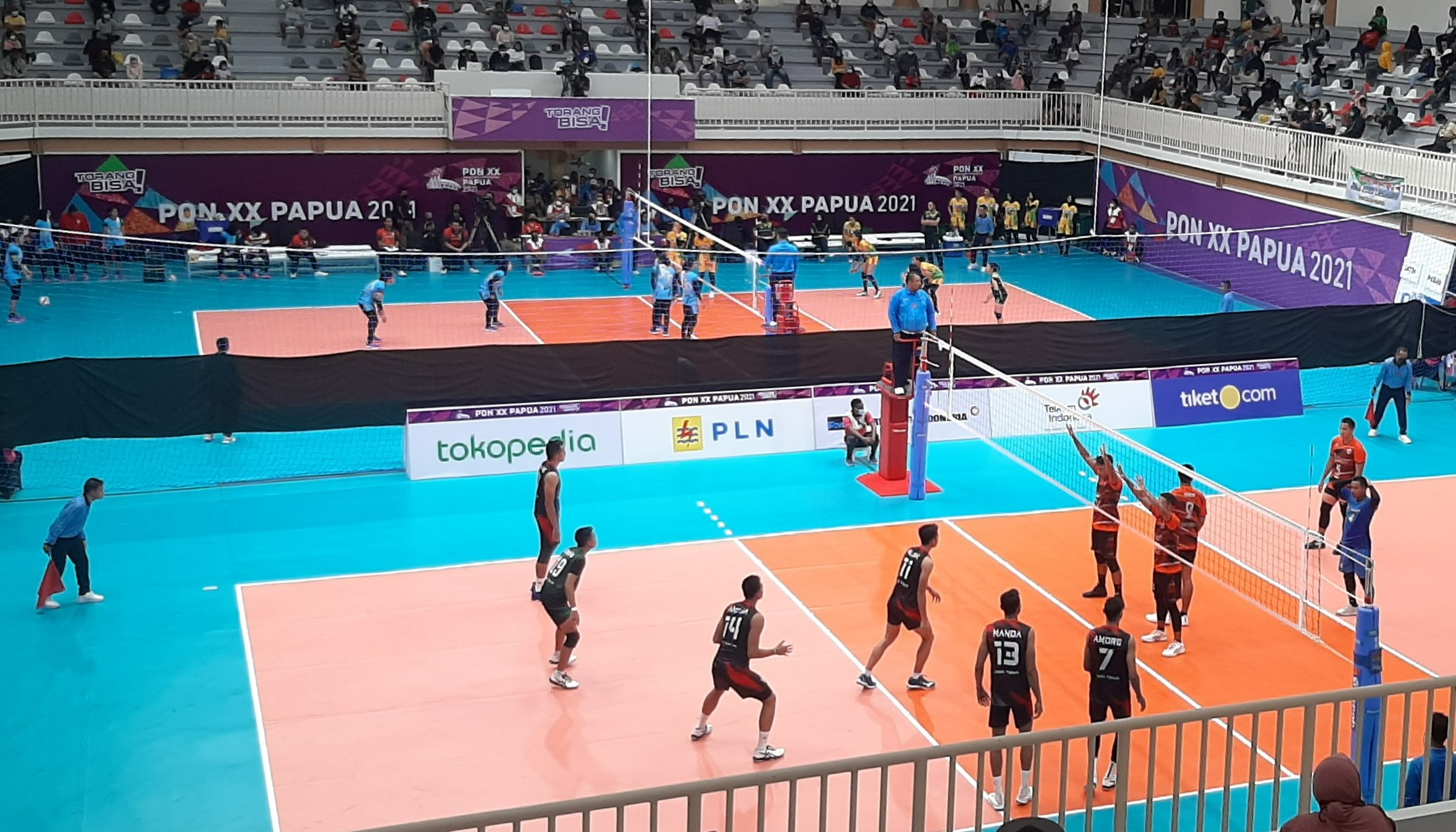 Voli putra DKI Jakarta secara mengejutkan meraih kemenangan atas Jawa Timur di venue voli indoor, Koya Koso, Kota Jayapura, Senin (4/10/2021).
