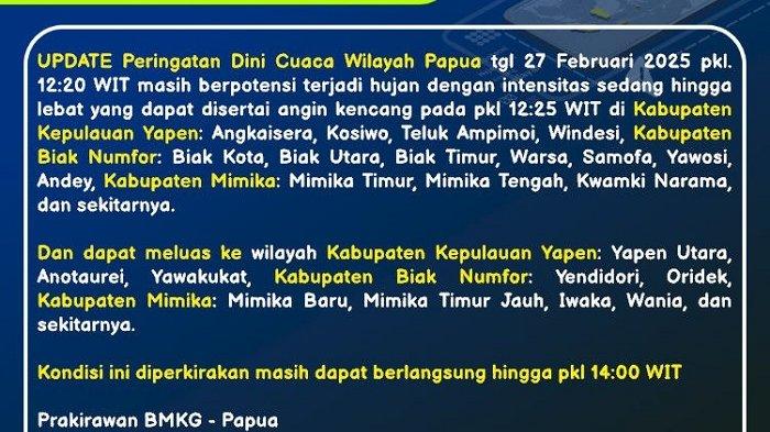 Berdasarkan data BMKG Papua, asih berpotensi terjadi hujan sedang hingga lebat yang dapat disertai angin kencang pada pukul 12:25 WIT di wilayah-wilayah berikut: