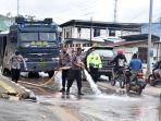 Dua unit Mobil AWC Polresta Jayapura Kota dan Sat Brimob Polda Papua diterjunkan untuk bersihkan material yang menutup diserpanjang jalan raya Sentani
